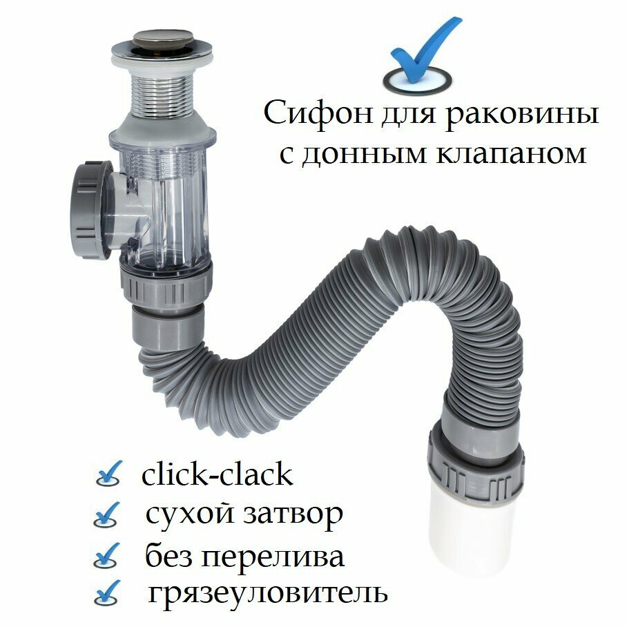 Сифон для раковины с донным клапаном клик-клак (нажимной) без перелива / обратный клапан (сухой затвор) универсальный выход в пол или стену информация: