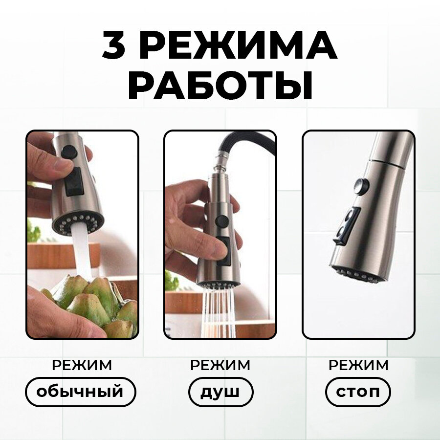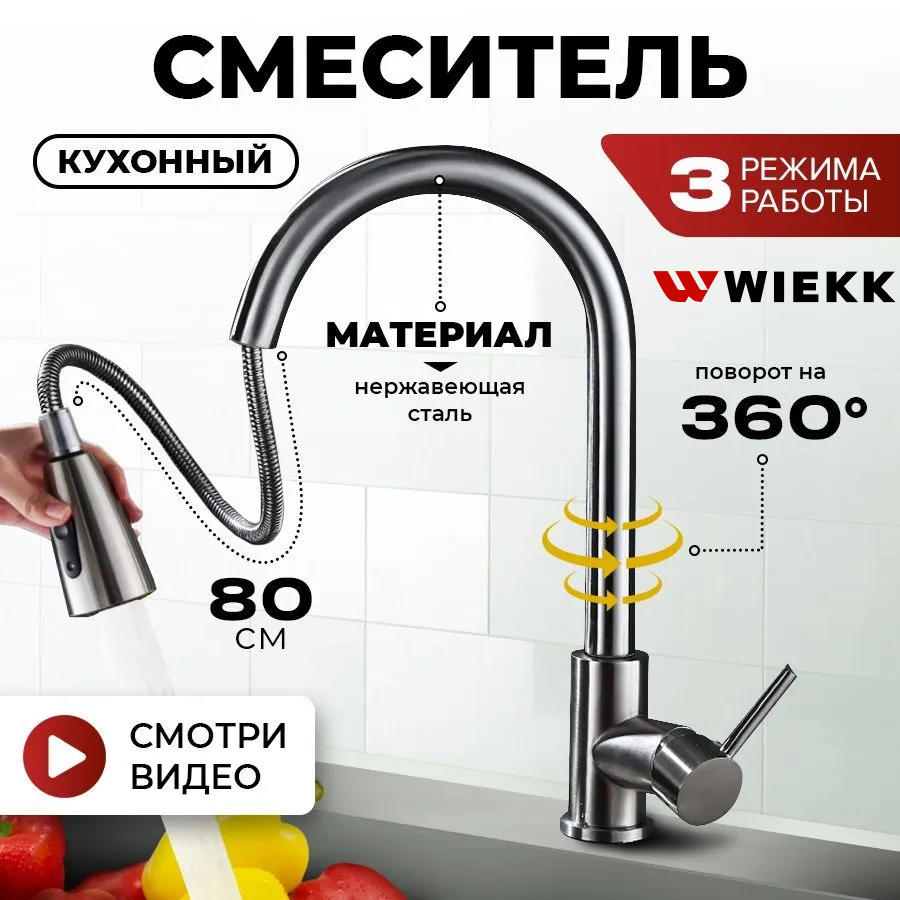 Отзывы на Смеситель для кухни и раковины Wiekk с выдвижным изливом, серый, алюминиевый