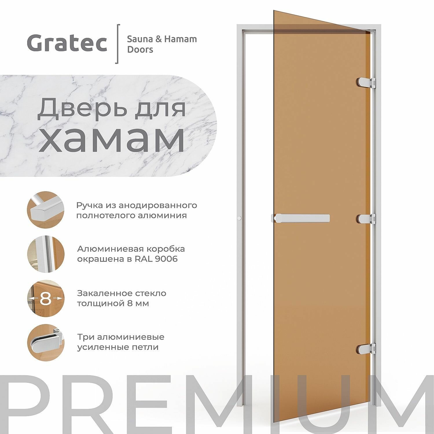 Отзывы на Дверь для хамам Gratec Estri Premium, бронза прозрачное закаленное стекло 8 мм, правое открывание