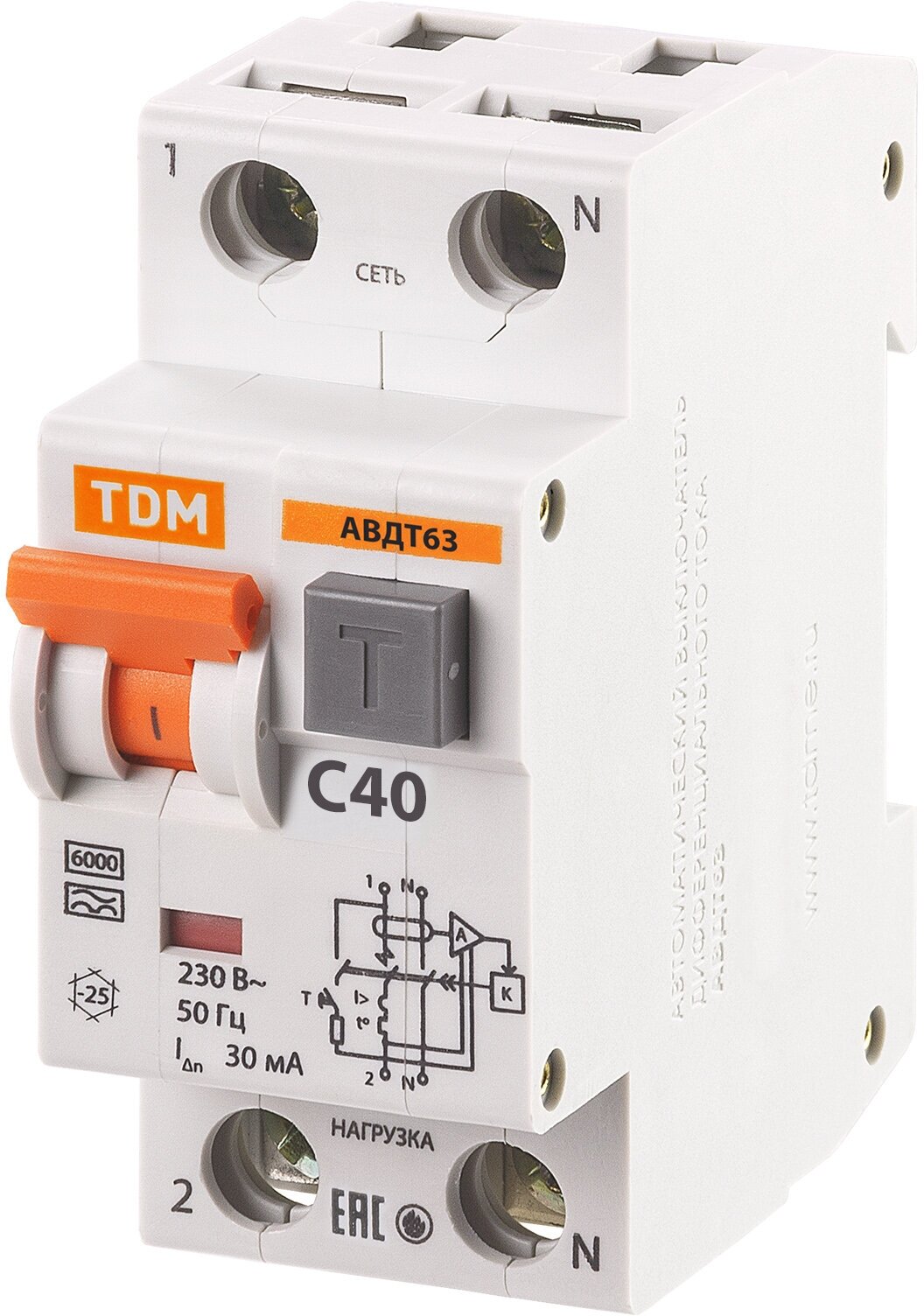 Автоматический выключатель дифференциального тока TDM АВДТ 63, 2Р, 40А, С, 30мА, 6кА, тип А информация: