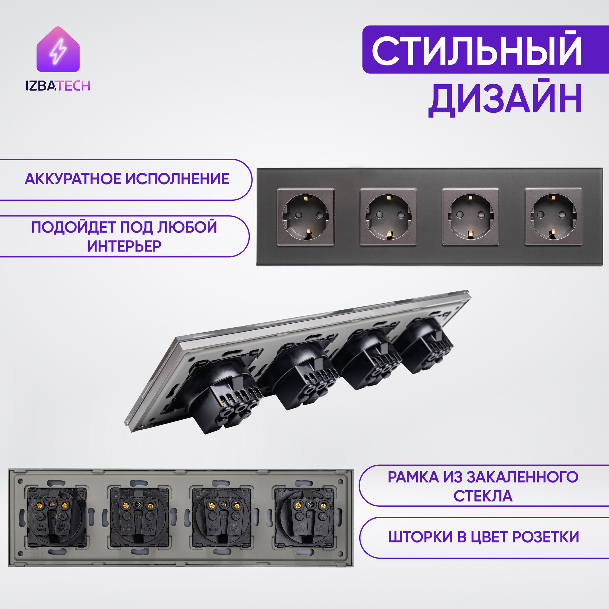 Отзывы на Встраиваемая розетка на 4 поста в стеклянной серой рамке 16А с заземлением и защитой от детей