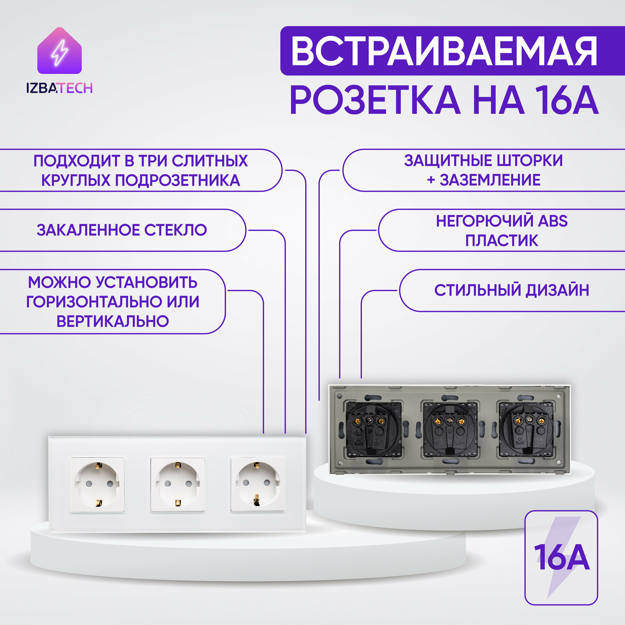 Отзывы на Тройная встраиваемая розетка белая на 3 поста 16А в рамке из закаленного стекла с заземлением и защитой от детей