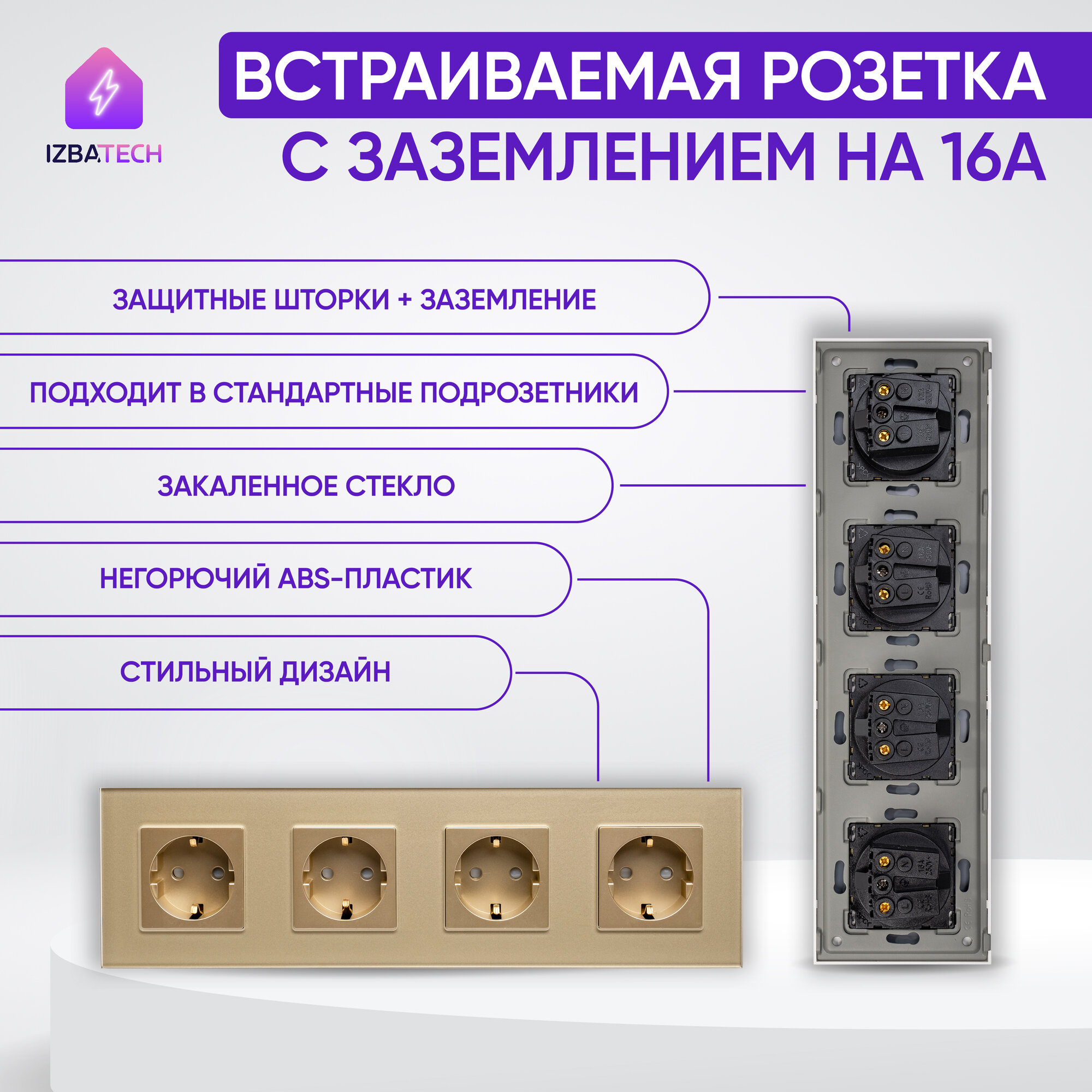 Отзывы на Встраиваемая розетка на 4 поста в стеклянной золотой рамке 16А с заземлением и защитой от детей