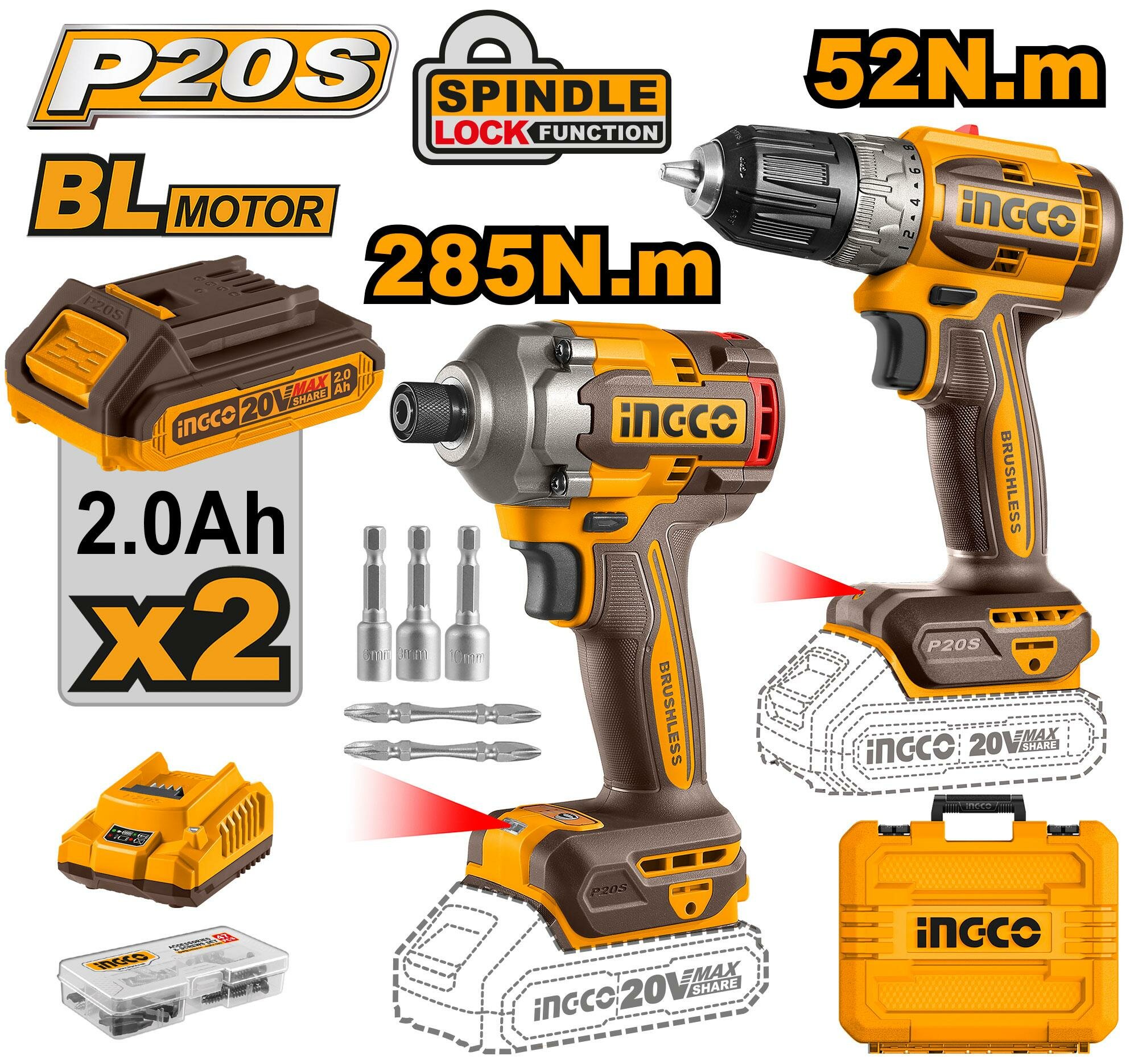 10 цен на Набор шуруповерт и бесщеточный импульсный винтоверт INGCO CKLI20272 INDUSTRIAL 20 В