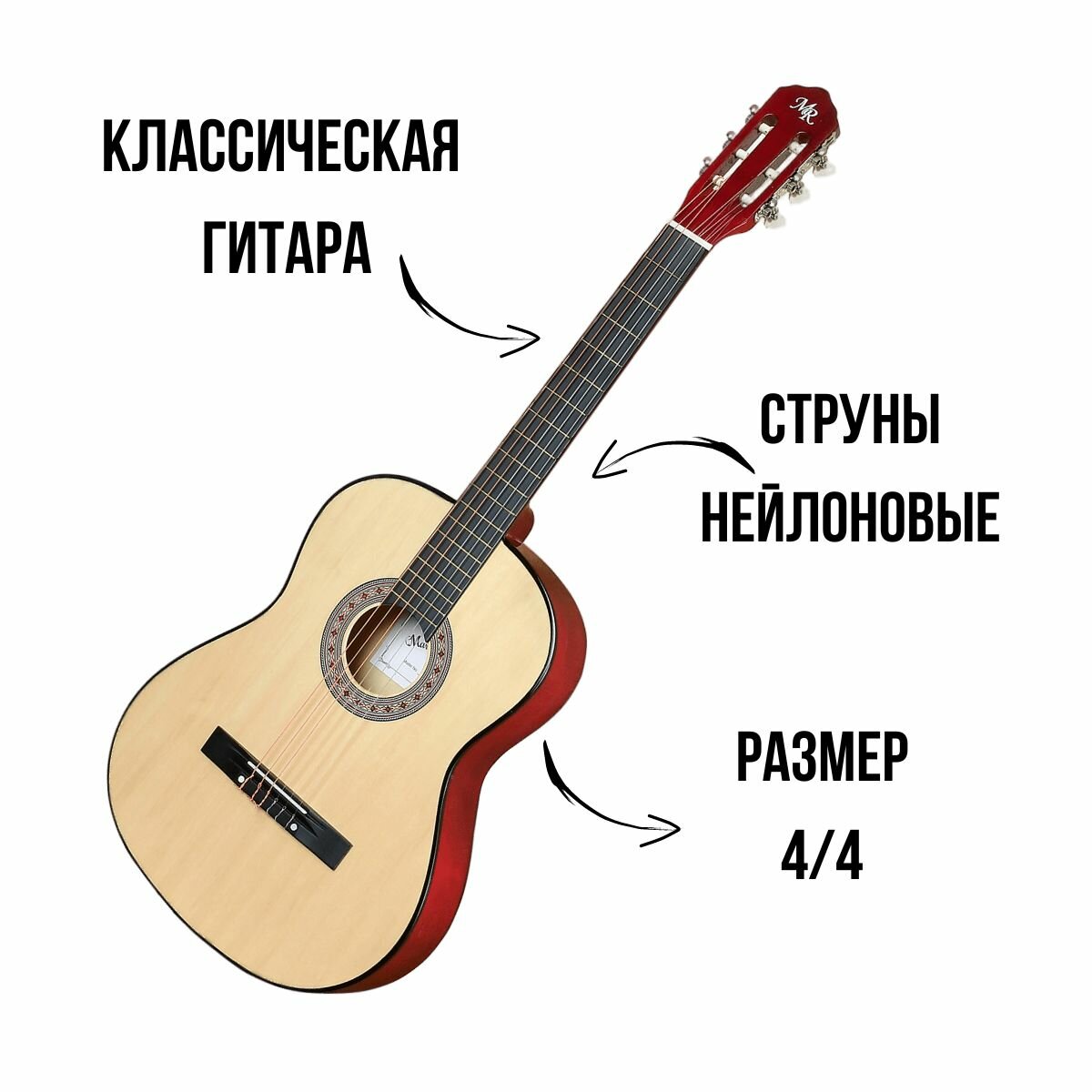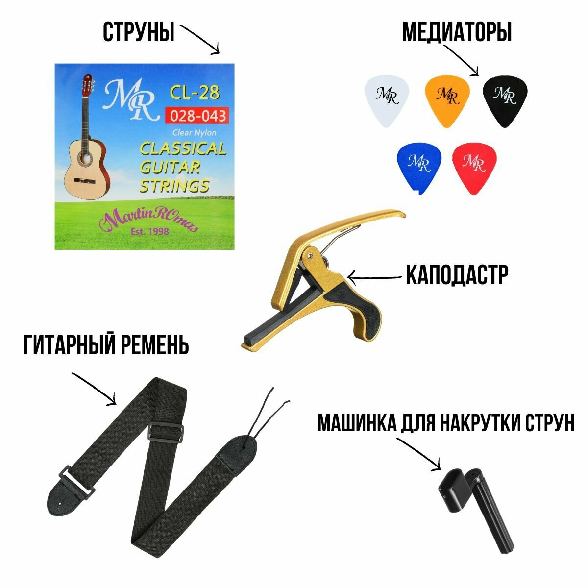 | В комплекте | Чехол для классической гитары размером 4/4, струны, ремень гитарный, каподастр, комплект медиаторов, машинка для накрутки струн. |