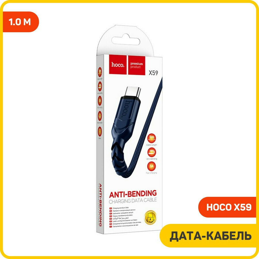 Кабель HOCO X59 Victory USB на Type-C, 3A, 1 метр синий, для зарядки гаджетов и передачи данных 243 ₽