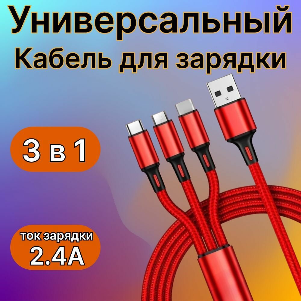 Отзывы на Зарядный кабель 3 в 1 универсальный для телефона с разъемами Type-С, Lightning, Micro-USB, красный