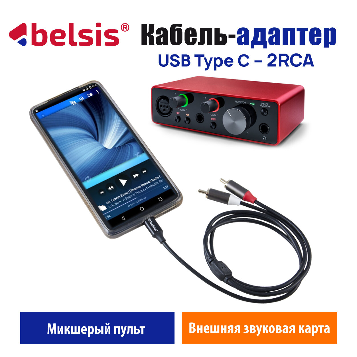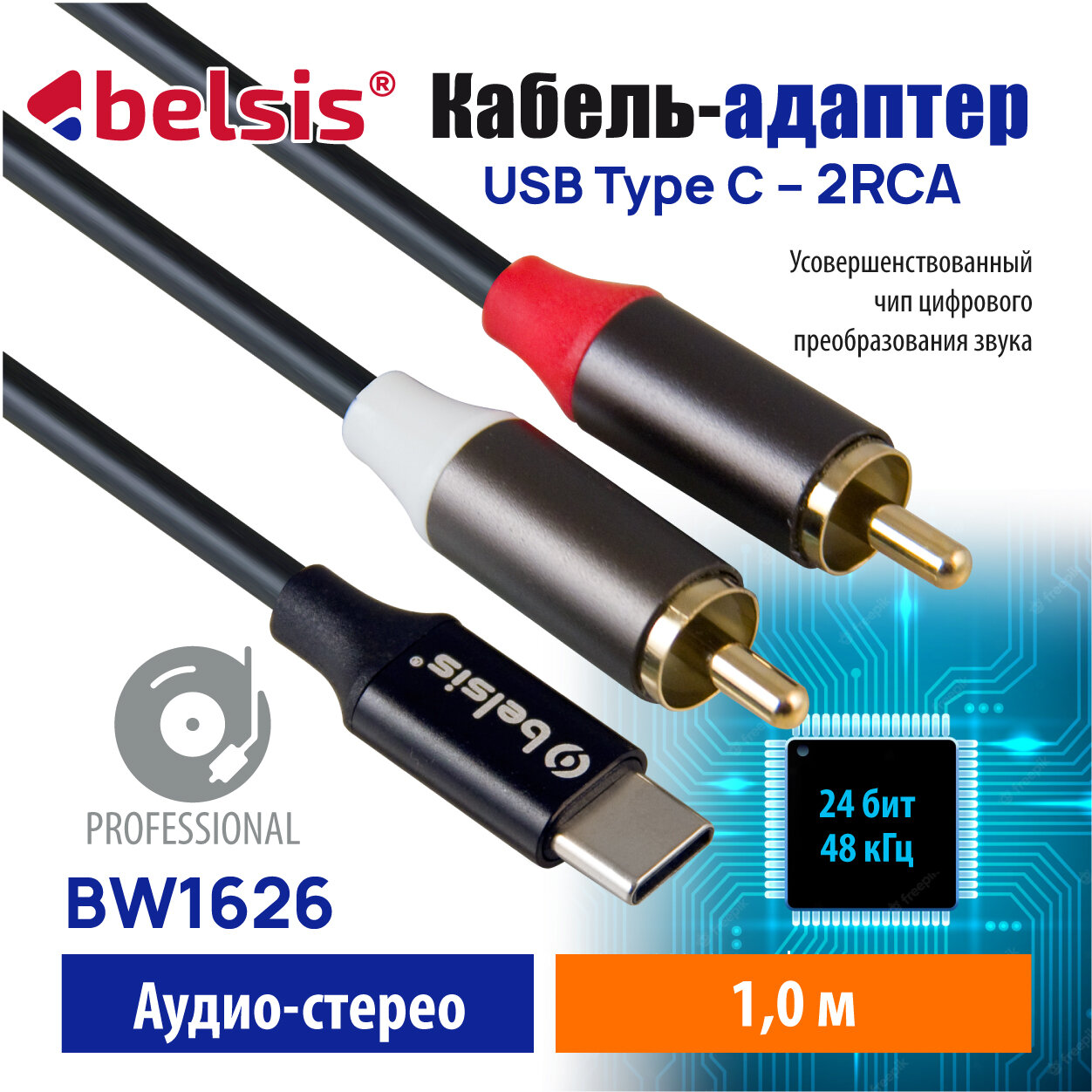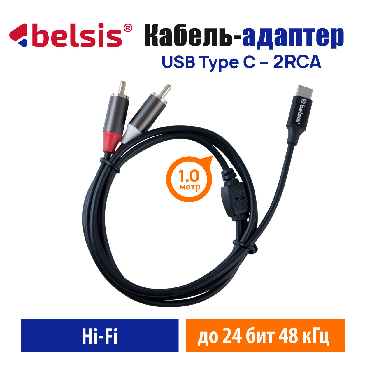Кабель USB Type C 2RCA 24 бит /48 кГц. Аудио Стерео длина 1м, Belsis, совместим с саундбоксом, AV ресивером, Микшером, Car Audio и др/BW1626 информация: