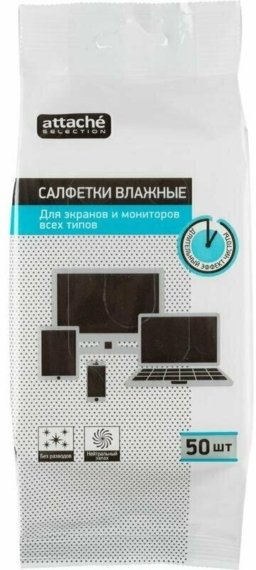 Салфетки влажные Attache Selection для экранов (50 штук в упаковке), 765899 информация: