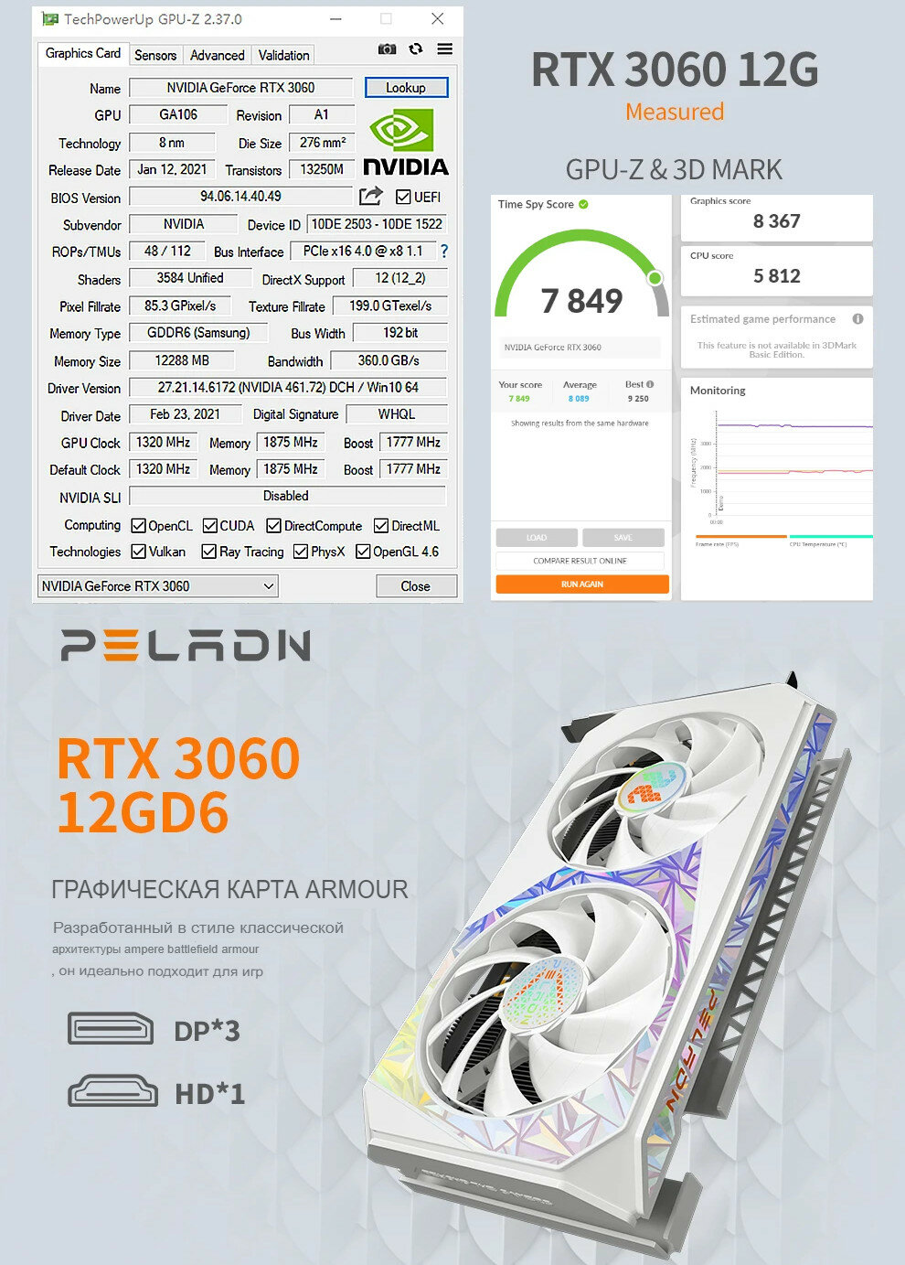 Видеокарта Nvidia GeForce RTX 3060 12G GDDR6 (ARMOUR DUAL 2XW) информация: