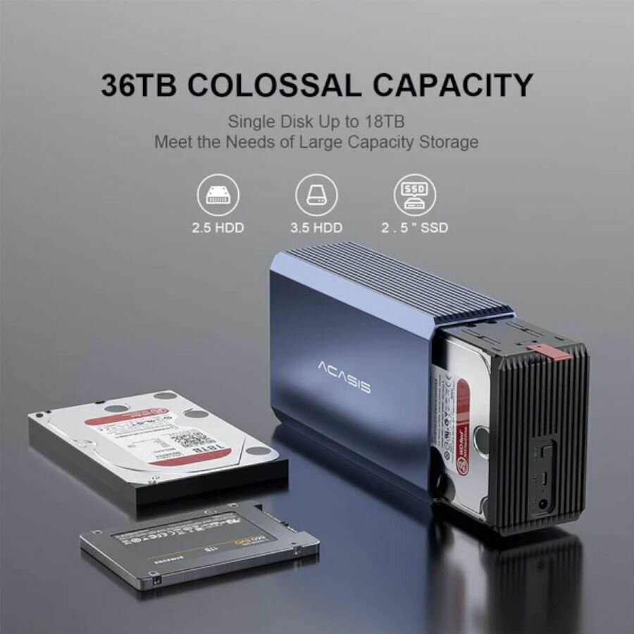 Корпус для жесткого диска Acasis EC-7352 USB-C с двумя отсеками 2,5 / 3,5 дюйма SATA HDD, SSD с матричным корпусом с Dip-переключателем режима 4 RAID