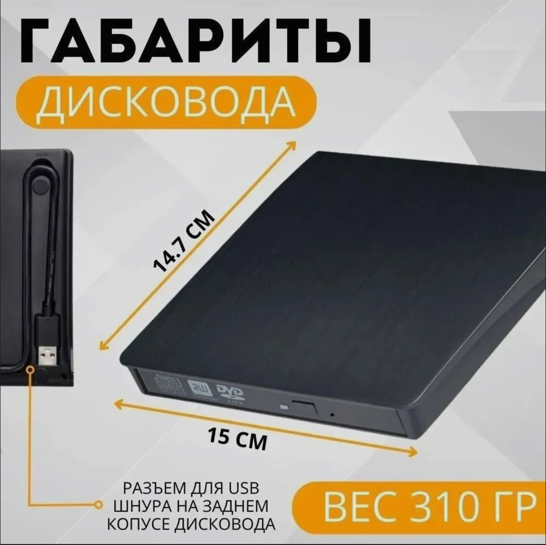 Внешний дисковод DVD/СD-RW черный для компьютера и ноутбука, внешний двд привод проводной.