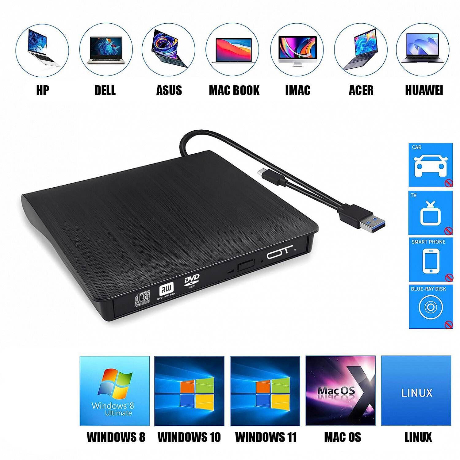 10 цен на Внешний дисковод для ноутбука и ПК USB 3.0 / Type-C CD-RW, DVD-RW Орбита OT-PCA03