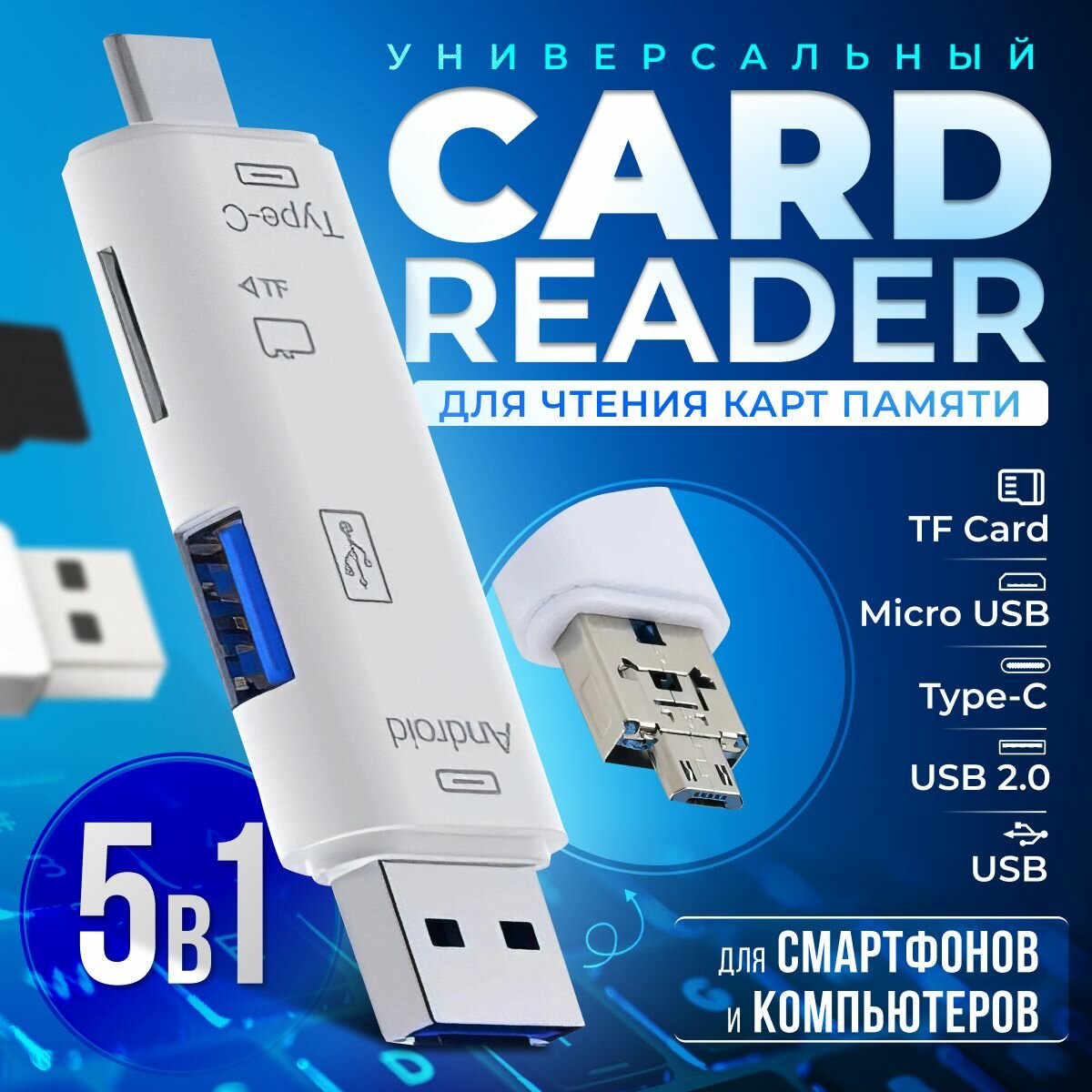 Картридер ридер 5 в 1 / адаптер-переходник универсальный, белый цвет информация: