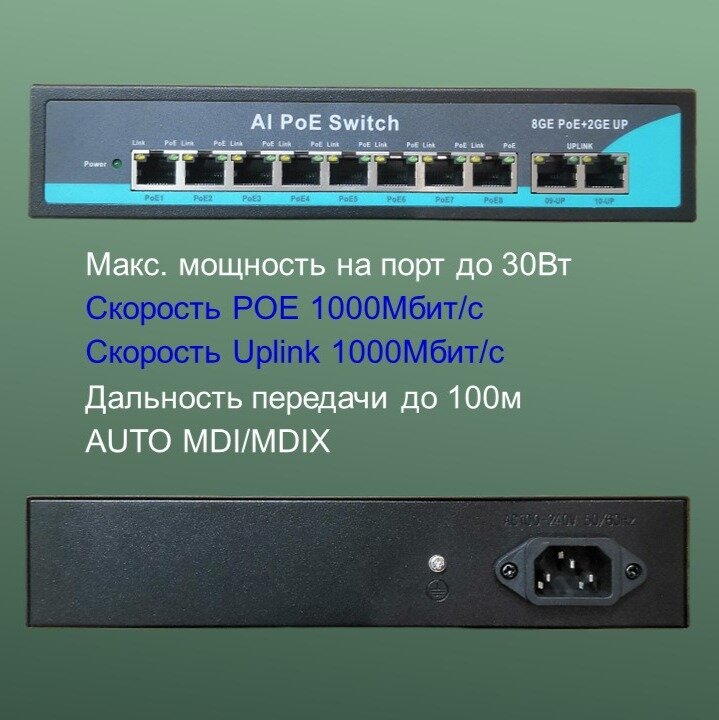 POE (свитч) 8POE 1000Мбит/с +2Uplinк 1000 Мбит/с (гигабит), WatchDog, 120 Ватт, switch IC REALTEK
