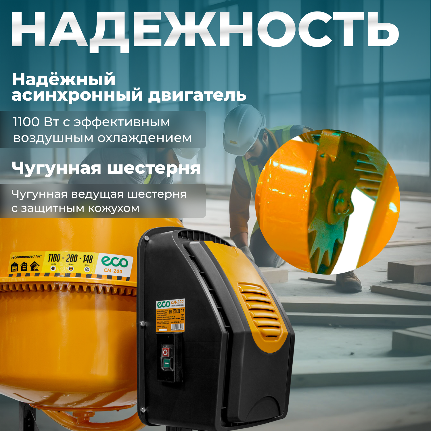 Бетономешалка электрическая ECO CM-200 (объём 200/148 л, 1100 Вт, 230 В, вес 54 кг) (EC3410-7) информация: