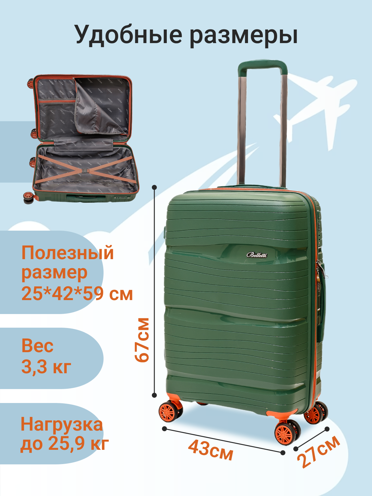 Чемодан на колесах BELLETTI 3052-67см (зеленый/коралловый) M, 61,9 л, полипропилен информация: