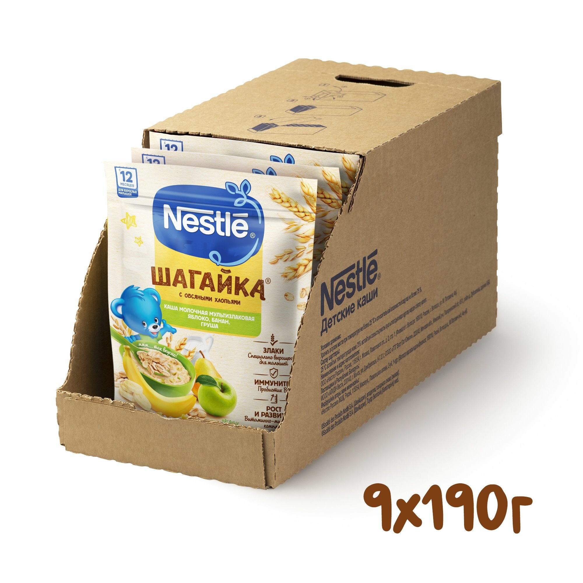 Каша мультизлаковая NESTLE Шагайка молочная, с яблоком, бананом и грушей, с 12 месяцев, 190г