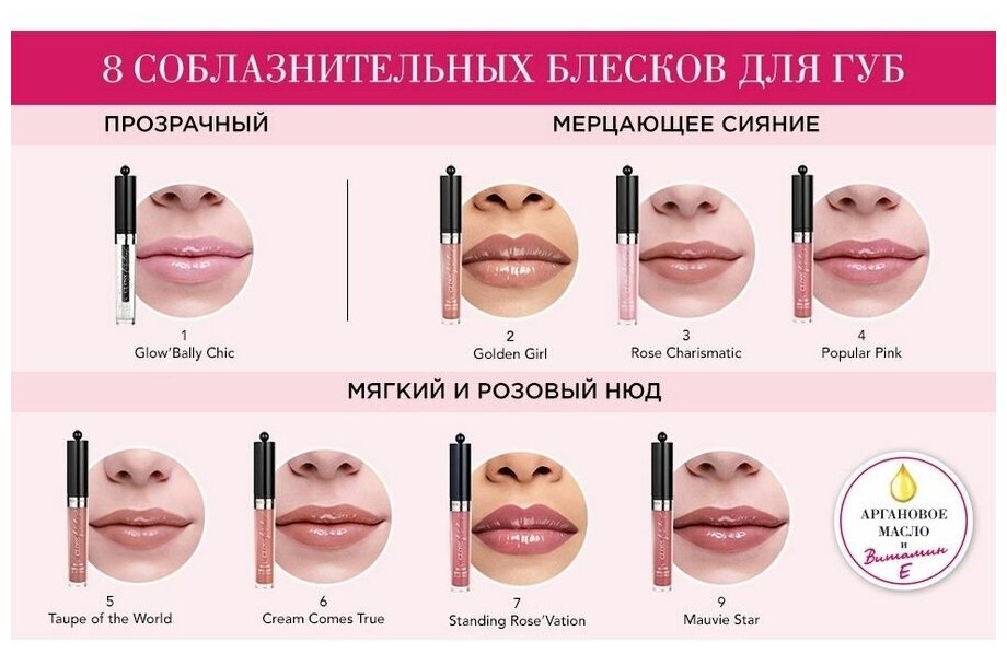 | Цвет товара | 01 glow'bally chic, 02 golden girl, 03 rose charismatic, 04 popular pink, 05 taupe of the world, 06 cream comes true, 07 standing rose'vation, 09 mauvie star, 2, 3, кремовый, прозрачный |