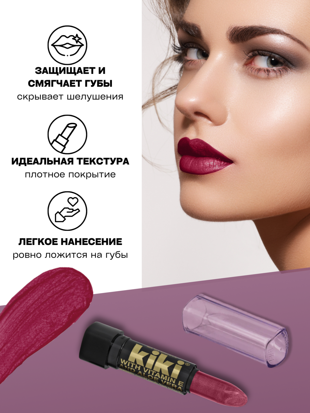 | Дополнительная информация | в состав классической губной помады KIKI введены группы витаминов и масел, которые защищают, разглаживают, смягчают губы и усиливают передачу глубины цвета; активный ингредиент: витамин E; масла и экстракты: масло алоэ вера |