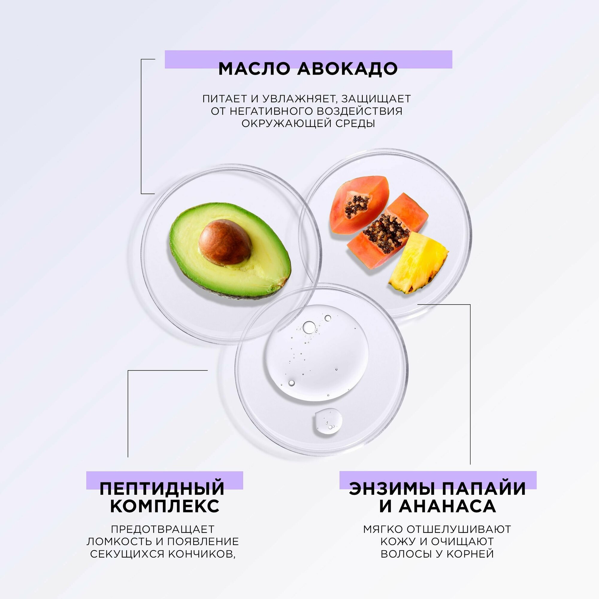 | Состав | вода / Лаурет Сульфат Натрия / Децил Глюкозид / Кокамидопропил Бетаин / Хлорид Натрия / Кокамид Диэтаноламин / Инулин / Линолеамидопропил ПГ-Димония Хлорид Фосфат / пропиленгликоль / Бромелаин / Папаин / Масло Авокадо / ПЭГ-7 Глицерил Кокоат / ПЭГ-40 Гидрогенизированное Касторовое Масло / Трипептид Меди / Лимонная Кислота / Динатрия ЭДTA / Метилхлоризотиазолинон / Метилизотиазолинон / Поликватерниум-10 / Парфюмерная Композиция. Вода / цетеариловый спирт / масло макадамии / Цетримония Хлорид / Бехентримония Хлорид / диметикон / Мика / Оксид Олова / Диоксид Титана / Молочная Кислота / Масло Авокадо / Гуар Гидроксипропилтримония Хлорид / Гидроксиэтилцеллюлоза / Бромелаин / Папаин / Трипептид Меди / Метилхлоротиазолинон / Метилизотиазолинон / Парфюмерная Композиция. |