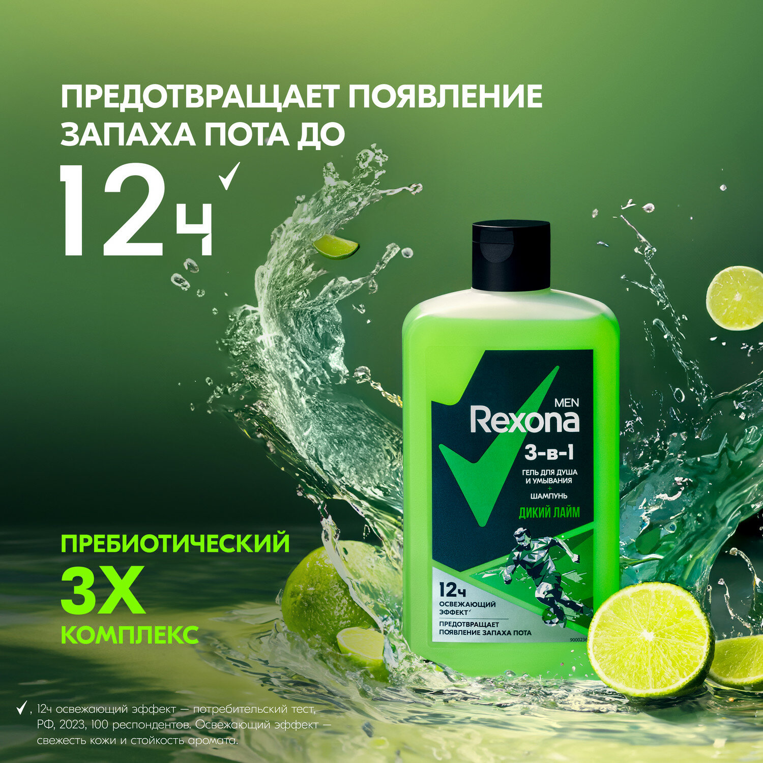 10 цен на Rexona Men гель для душа, умывания и шампунь 3 в 1 Дикий лайм 490 мл