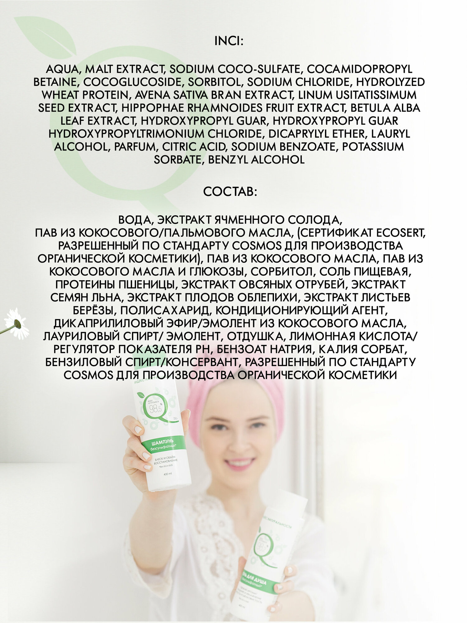 | Состав | Aqua (Вода), Malt Extract (Экстракт солода), Sodium Coco-sulfate (ПАВ из кокосового масла), Cocamidopropyl Betaine (ПАВ из кокосового масла), Coco-Glucoside (ПАВ из кокосового масла и глюкозы), Sodium Chloride (Соль пищевая), Sorbitol (Сорбитол), Hydrolyzed Wheat Protein (Протеины пшеницы), Avena Sativa Bran Extract (Экстракт овсяных отрубей), Linum Usitatissimum Seed Extract (Экстракт семян льна), Hippophae Rhamnoides Fruit Extract (Экстракт плодов облепихи), Betula Alba Leaf Extract (Экстракт листьев берёзы), Hydroxypropyl Guar (Полисахарид), Hydroxypropyl Guar Hydroxypropyltrimonium Chloride (Кондиционирующий агент), Dicaprylyl Ether (Дикаприлиловый эфир/ эмолент из кокосового масла), Lauryl Alcohol (Лауриловый спирт/ кондиционер), Parfum (отдушка), Citric Acid (Лимонная кислота/ регулятор pH), Benzyl Alcohol (Бензиловый спирт), Sodium Benzoate (Бензоат натрия), Potassium Sorbate (Калия сорбат) - консерванты, разрешенные по стандартам COSMOS для производства органической косметики. |