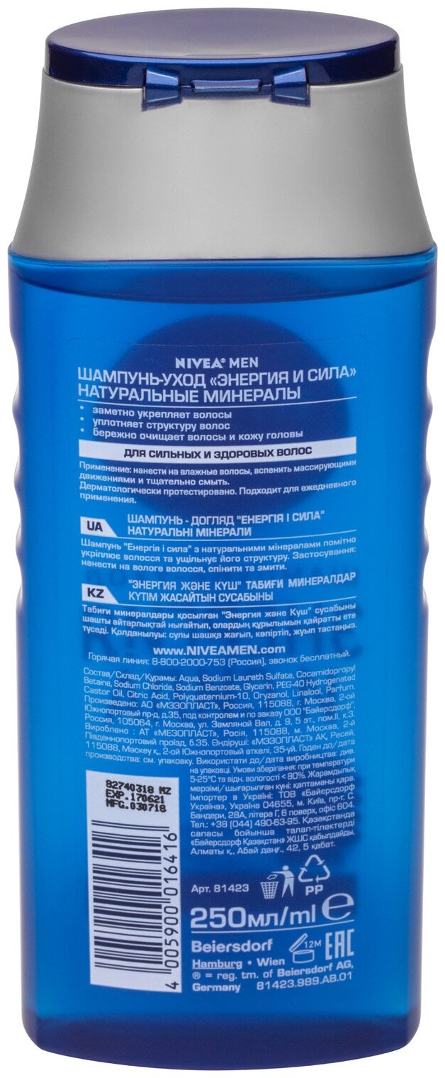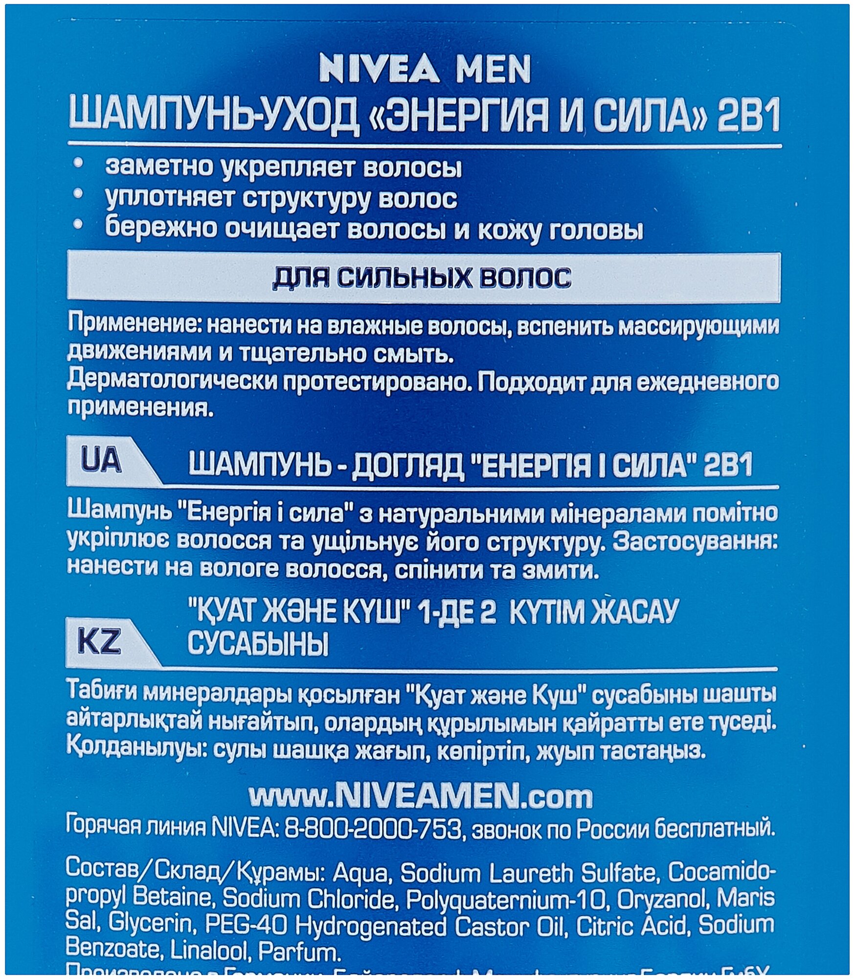 Шампунь Nivea для волос Men Энергия и сила, 250 мл, 2 шт. информация: