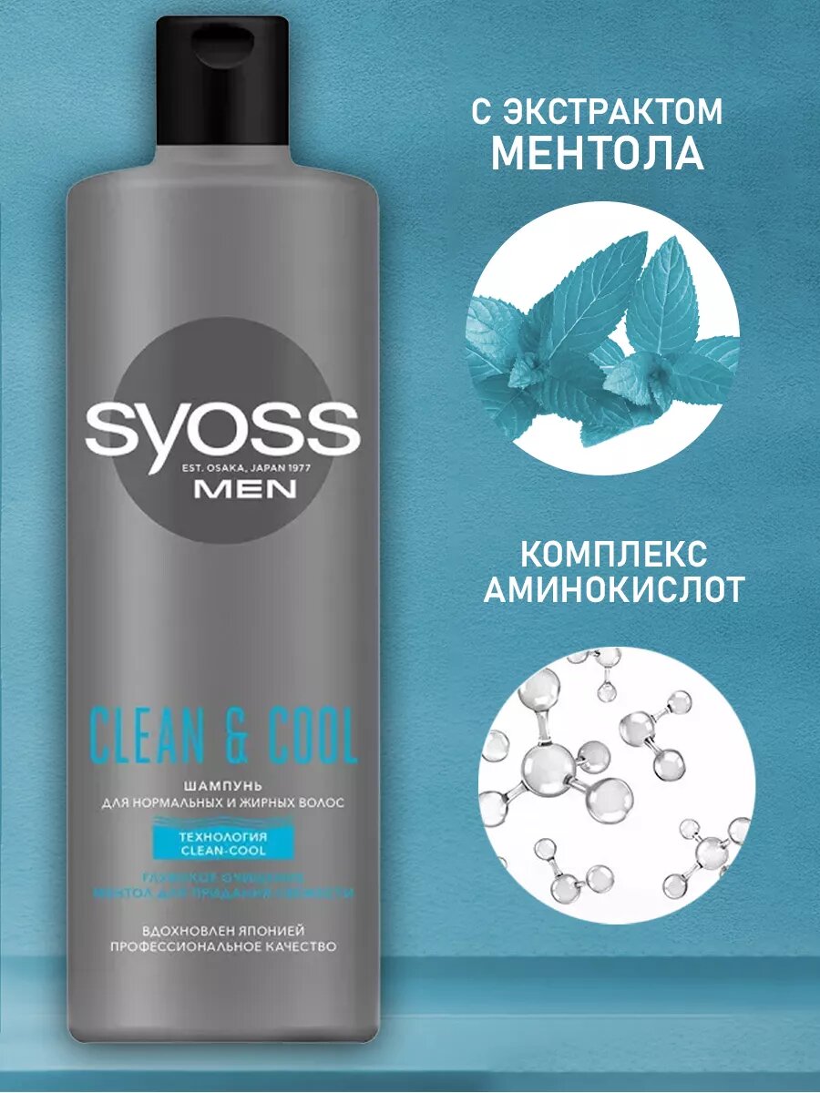 Syoss Шампунь мужской Clean & Cool, для нормальных и жирных волос, глубокое очищение, 450 мл