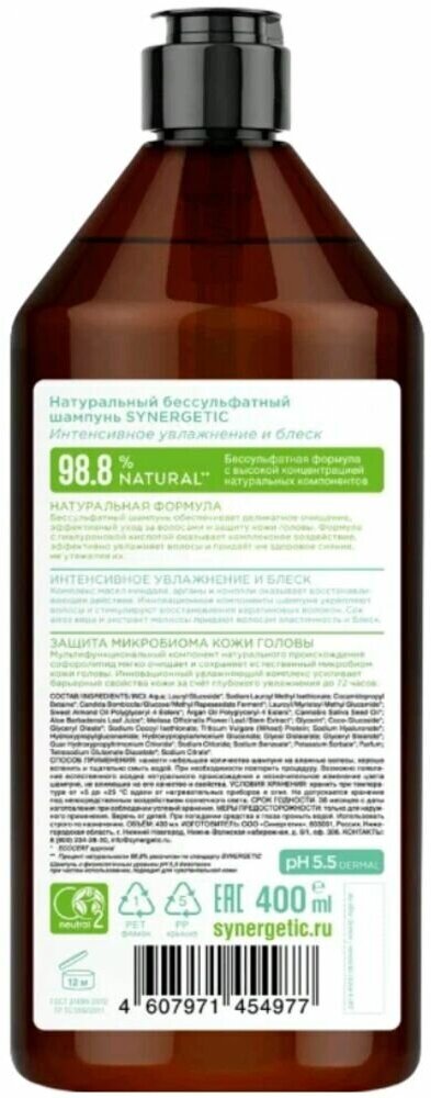 Бессульфатный шампунь Synergetic Интенсивное увлажнение и блеск, 400 мл информация: