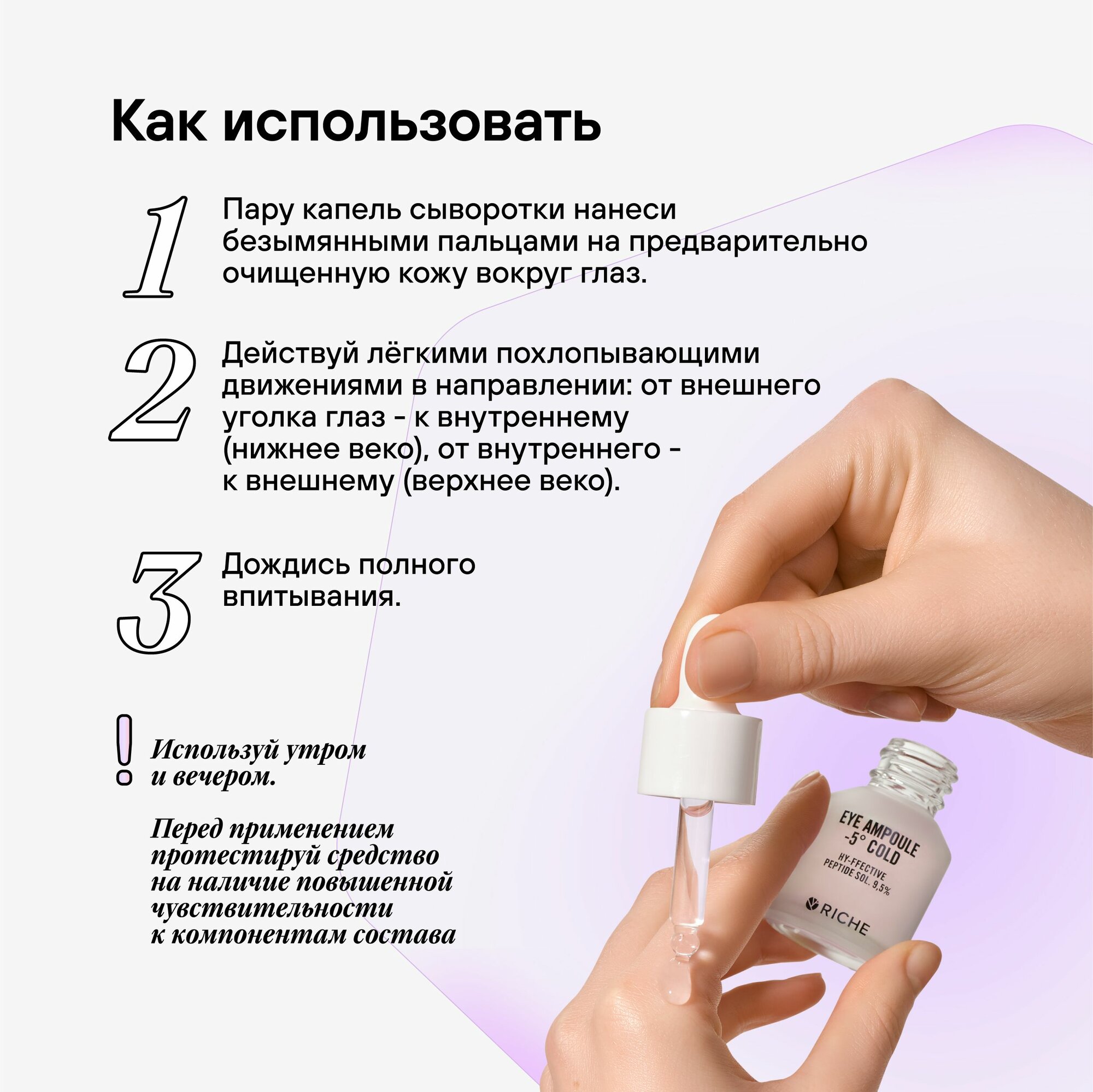 | Способ применения | Применение: пару капель сыворотки нанеси безымянными пальцами на предварительно очищенную кожу вокруг глаз. Действуй лёгкими похлопывающими движениями в направлении: от внутреннего уголка глаза — к внешнему (нижнее веко); от внешнего — к внутреннему (верхнее веко). Дождись полного впитывания. Используй утром и вечером. Перед применением протестируй средство на наличие повышенной чувствительности к компонентам состава. |