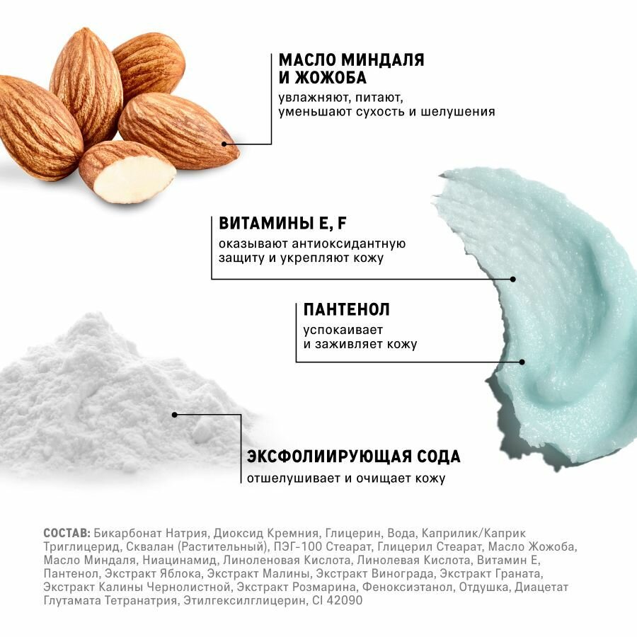 | Состав | Бикарбонат натрия, диоксид кремния, глицерин, вода, каприловый/каприновый триглицерид, сквалан (растительный), ПЭГ-100 стеарат, глицерил стеарат, масло жожоба, масло сладкого миндаля, ниацинамид, линоленовая кислота, линолевая кислота, токоферола ацетат, пантенол, экстракт яблока, эктракт малины, экстракт семян винограда, экстракт семян граната, экстракт калины чернолистной, экстракт розмарина, феноксиэтанол, отдушка, диацетат глутамата тетранатрия, этилгексилглицерин, Cl 42090" |