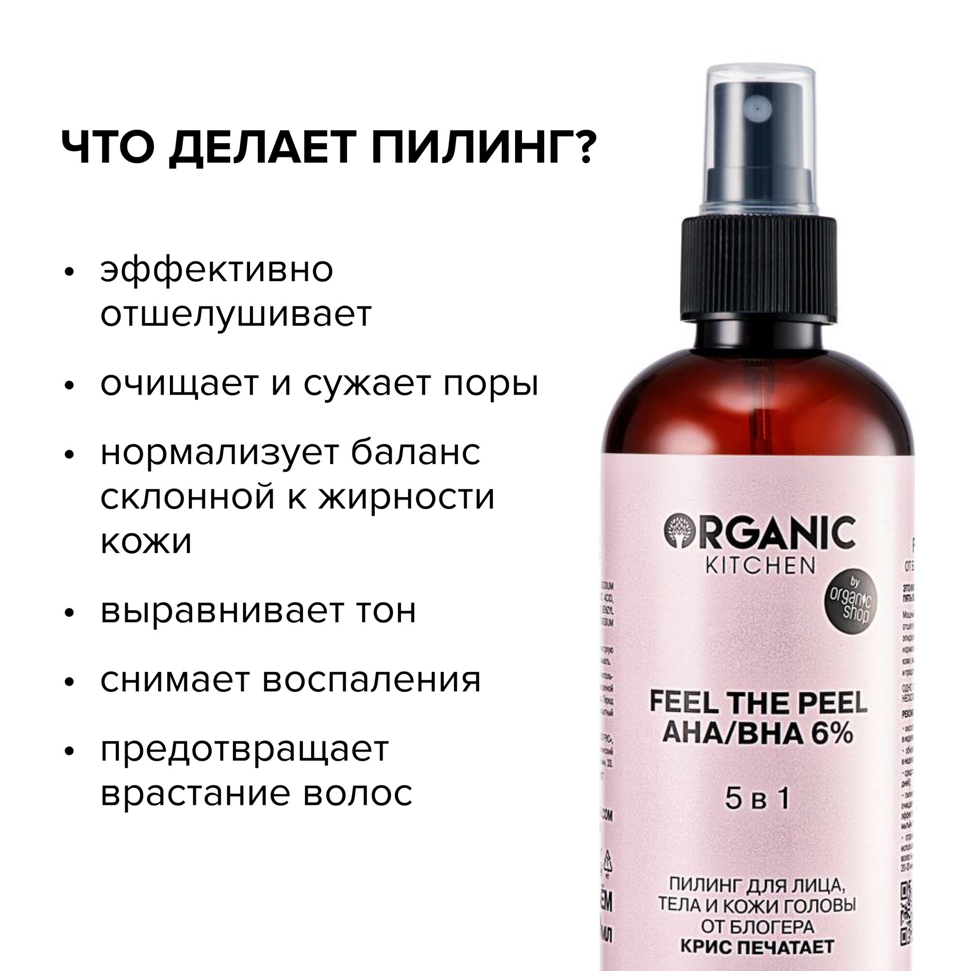 Organic Kitchen / Блогеры / Пилинг для лица, тела, кожи головы AHA/BHA 6% 5в1 "Feel the Peel" блогер Крис