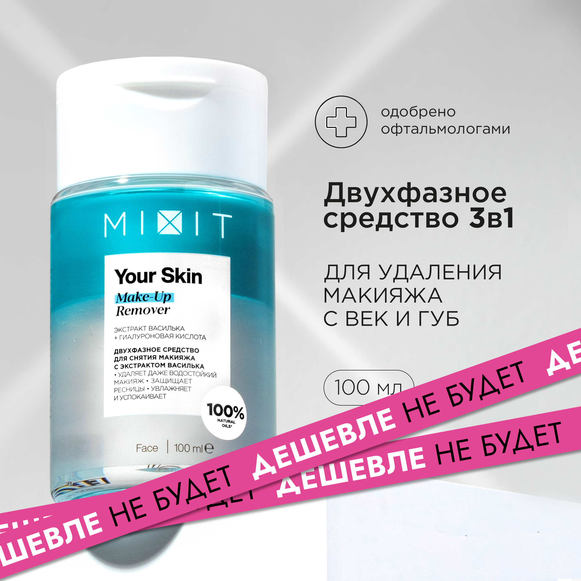 Средство для снятия водостойкого макияжа MIXIT Your Skin Make-Up Remover, двухфазное, профессиональное, с экстрактом василька, 100 мл информация:
