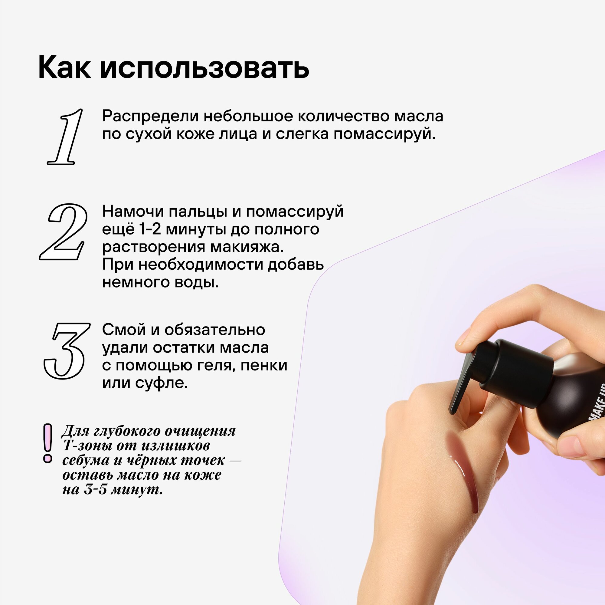 | Способ применения | Применение: 1. Распредели небольшое количество масла по сухой коже лица и слегка помассируй. Намочи пальцы и помассируй ещё 1-2 минуты до полного растворения макияжа. При необходимости добавь немного воды. Смой и удали остатки масла с помощью молочка. Для глубокого очищения Т-зоны от излишков себума и чёрных точек — оставь масло на коже на 3-5 минут. Не используй при высыпаниях! Уголь в составе дает наличие естественного осадка. Перед употреблением гидрофильное масло нужно взболтать. Важно! Не наноси масло на наращённые ресницы. 2. Небольшое количество молочка распредели по влажной коже лица и шеи легкими массирующими движениями. Смой тёплой водой и продолжи уход тоником. |