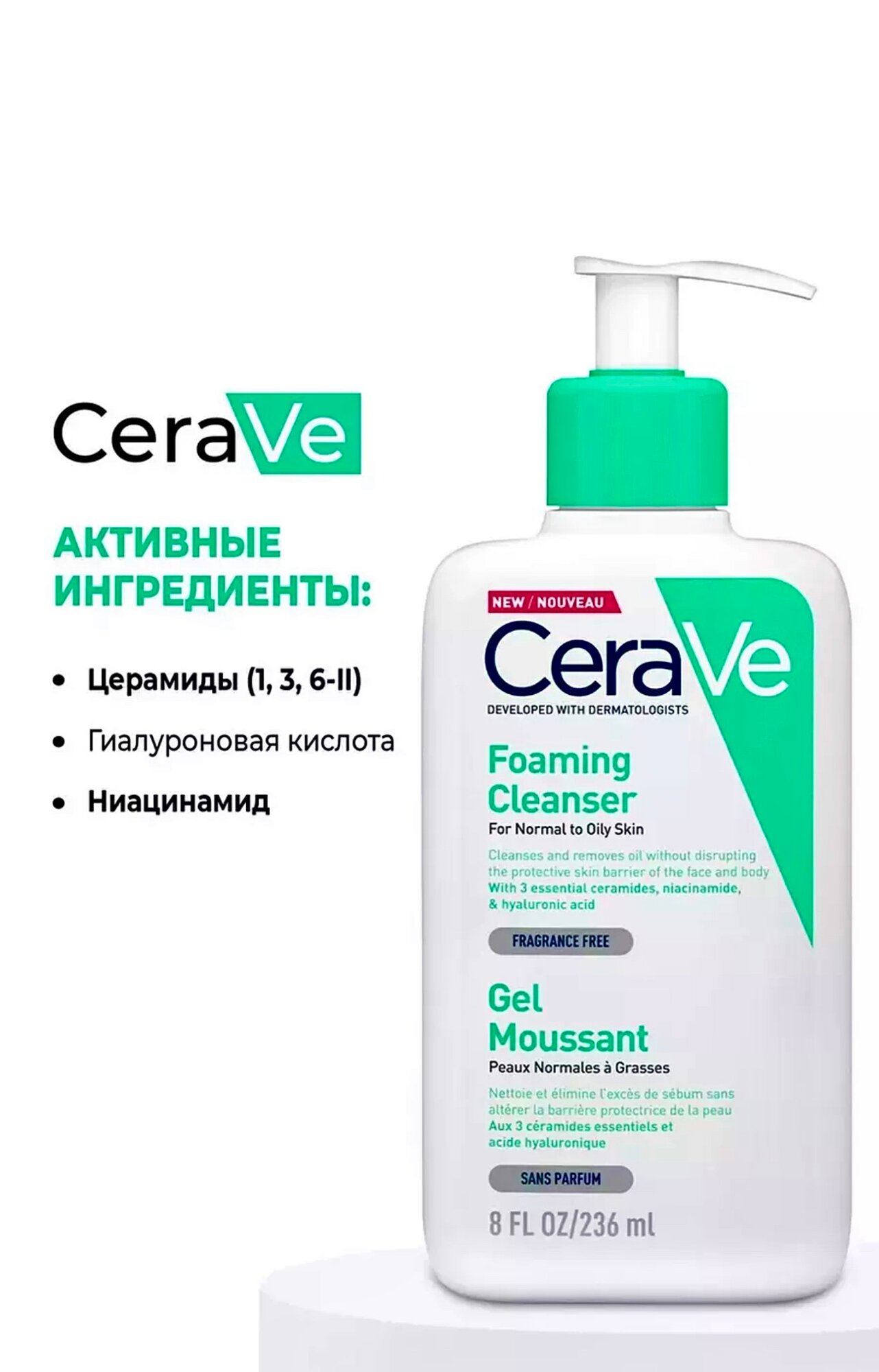 10 цен на CeraVe гель интенсивно очищающий для нормальной и жирной кожи, 236 мл