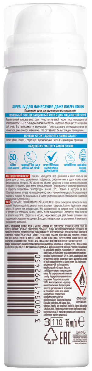 Garnier амбр солер Спрей для лица солнцезащитный невидимый с легкой текстурой SPF50 75мл информация: