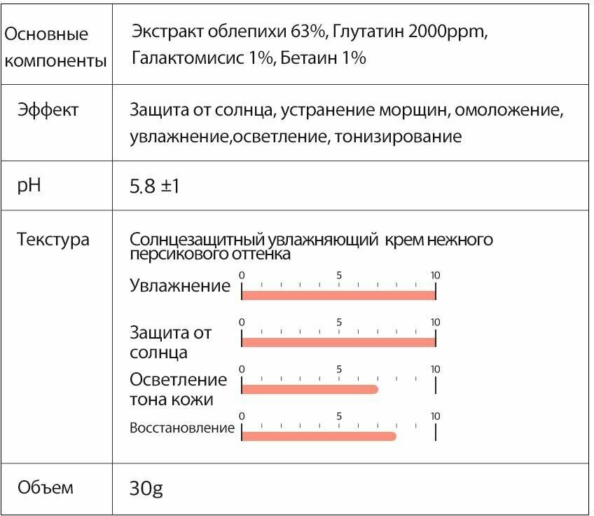 | Состав | Hippophae Rhamnoides (Sea Buckthorn) Extract (63.5%), Coco-Caprylate/Caprate (7.8%), Titanium Dioxide, Polysilicon-15 (8.0%). |