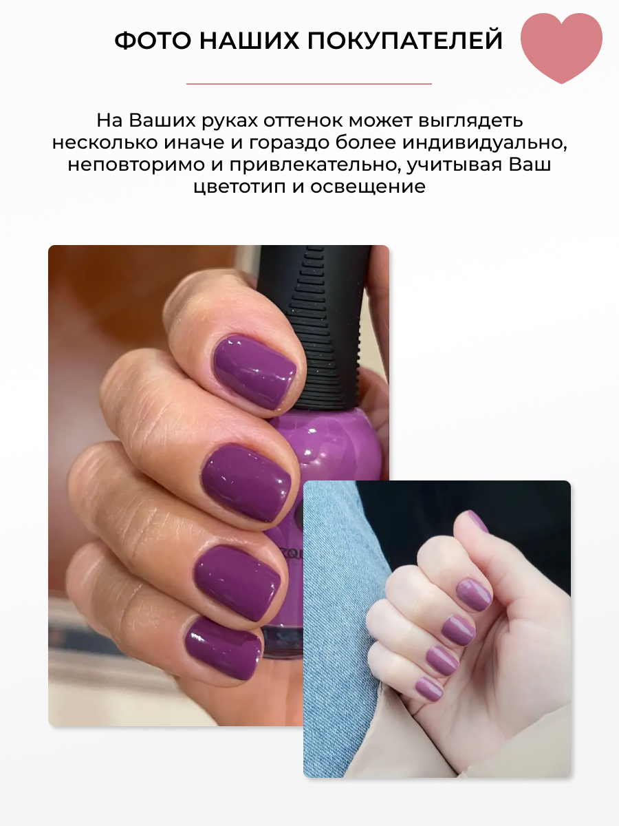 | Способ применения | хорошо перемешайте лак. Нанесите первый тонкий слой, дайте высохнуть 1-2 минуты, нанесите второй слой (гораздо лучше два тонких слоя лака, а не один толстый). Кисточкой с капелькой лака коснитесь середины ногтя, и ведите её к краю. Второе движение кисточкой вверх по ногтю, к линии кутикулы так, чтобы между лаком и задним валиком осталось маленькое свободное пространство. Оставшимся на ногте лаком аккуратно закрасьте боковые стороны ногтя. "Запечатайте" торец ногтя последним движением. Таким же образом наносится и второй слой |