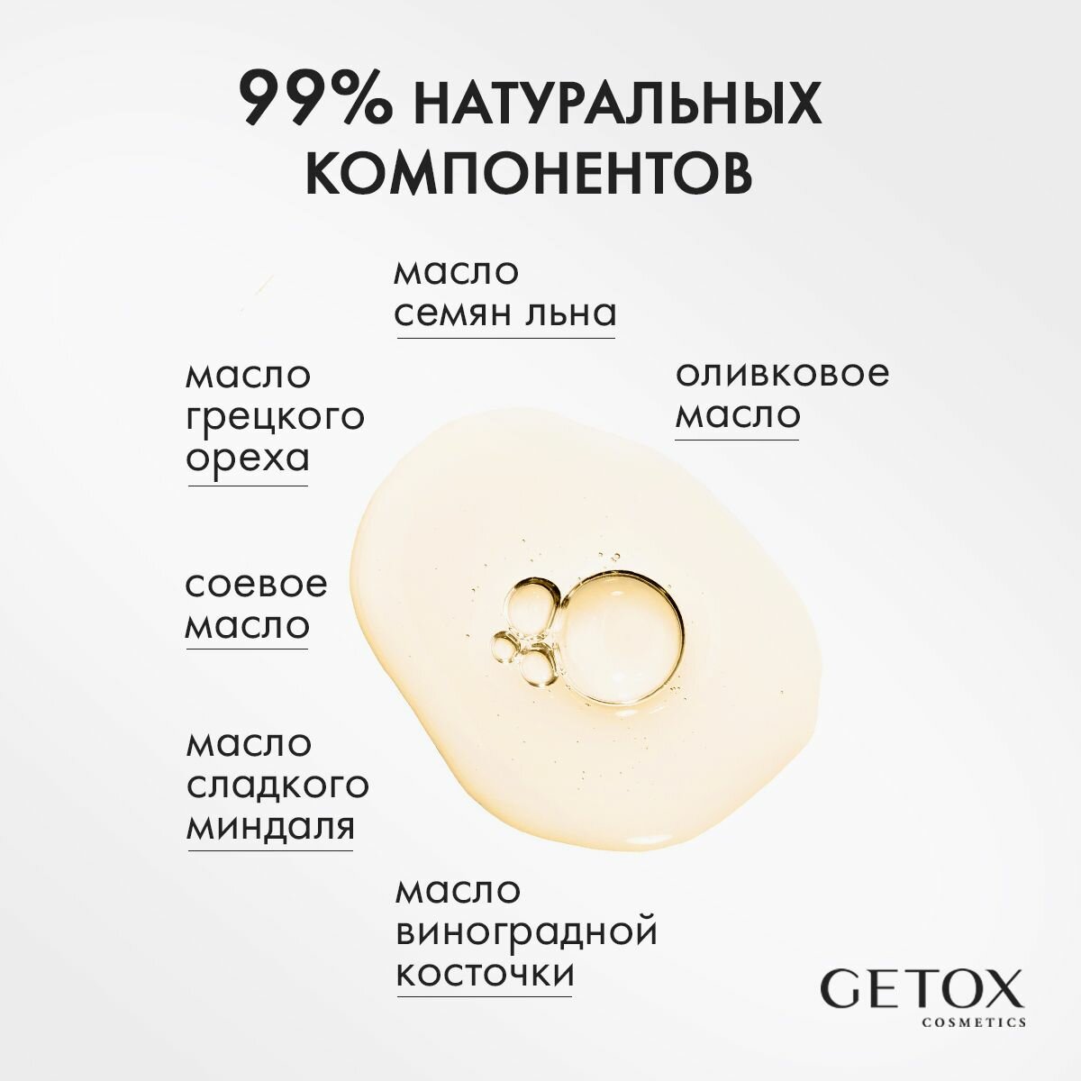 | Состав | Соевое масло, Масло виноградных косточек, Масло грецкого ореха, Отдушка, Масло оливы, Масло сладкого миндаля, Льняное семян льна, Токоферола ацетат |