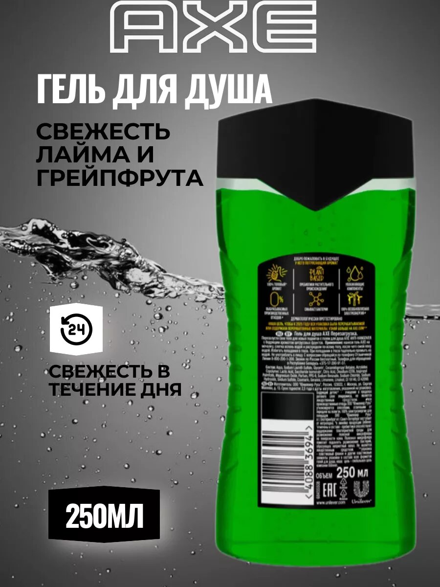| Способ применения | нанеси гель AXE на мочалку, слегка вспень водой и распредели по всему телу, после чего смой пену водой. Можешь использовать его как шампунь. Избегай попадания в глаза, при попадании тщательно промой их водой |