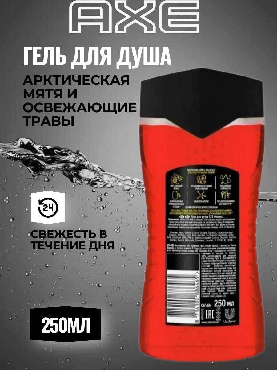 | Способ применения | нанеси гель AXE на мочалку, слегка вспень водой и распредели по всему телу, после чего смой пену водой. Можешь использовать его как шампунь. Избегай попадания в глаза, при попадании тщательно промой их водой |
