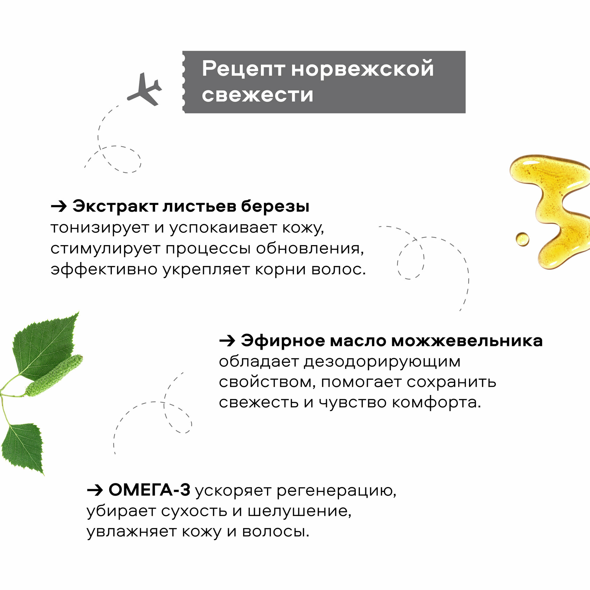 | Состав | Aqua with infusions of Betula Alba Leaf Extract (экстракт листьев березы), Juniperus Communis Wood Oil (масло можжевельника), Linolenic Acid (омега-3); Sodium Coco-Sulfate, Cocamidopropyl Betaine, Lauryl Glucoside, Sodium Chloride, Citric Acid, Benzyl Alcohol, Sodium Benzoate, Potassium Sorbate, Parfum |
