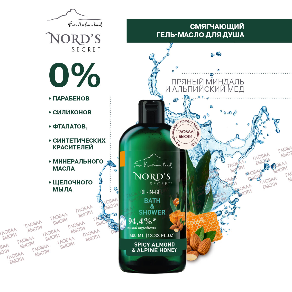 NORDS SECRET Смягчающий гель масло для душа "Пряный миндаль и альпийский мед", 400 мл 369 ₽
