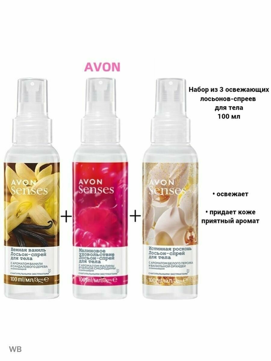 AVON Senses Набор спреев для тела 3*100 мл ("Орхидея и черника"+ "Малина и черная смородина" + "Ваниль и сандаловое дерево")