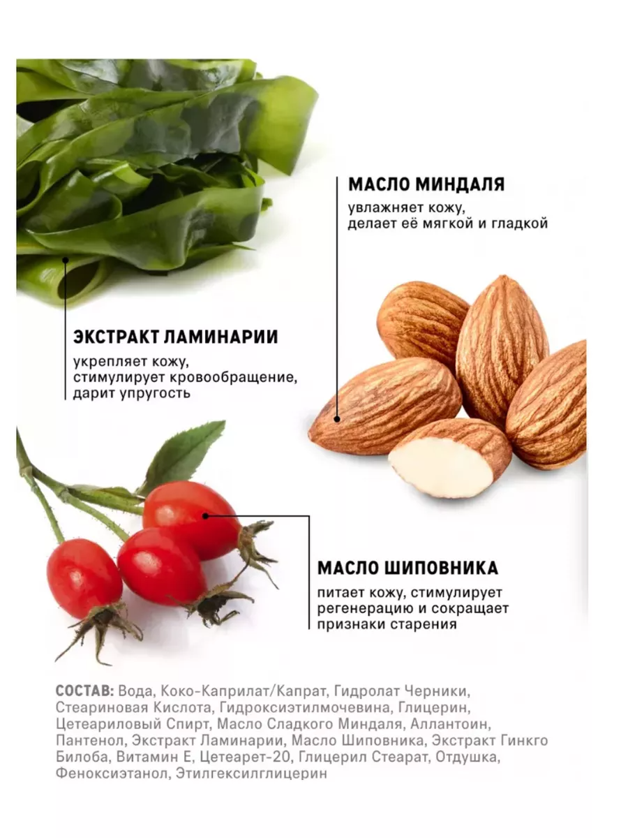 | Состав | Состав: Aqua (Water), Coco-Caprylate/Caprate, Vaccinium Myrtillus (Blueberry) Fruit Water, Stearic Acid, hydroxyethyl urea, Glycerin, Cetearyl Alcohol, Prunus Amygdalus Dulcis (Sweet Almond) Oil, Allantoin, Panthenol, LAMINARIA SACCHARINA (SUGAR KELP) EXTRACT, Rosa Canina (Rosehip) Fruit Oil, Ginkgo Biloba Extract, Tocopheryl Acetate, Ceteareth-20, Glyceryl Stearate, Fragrance, Phenoxyethanol, Ethylhexylglycerin |