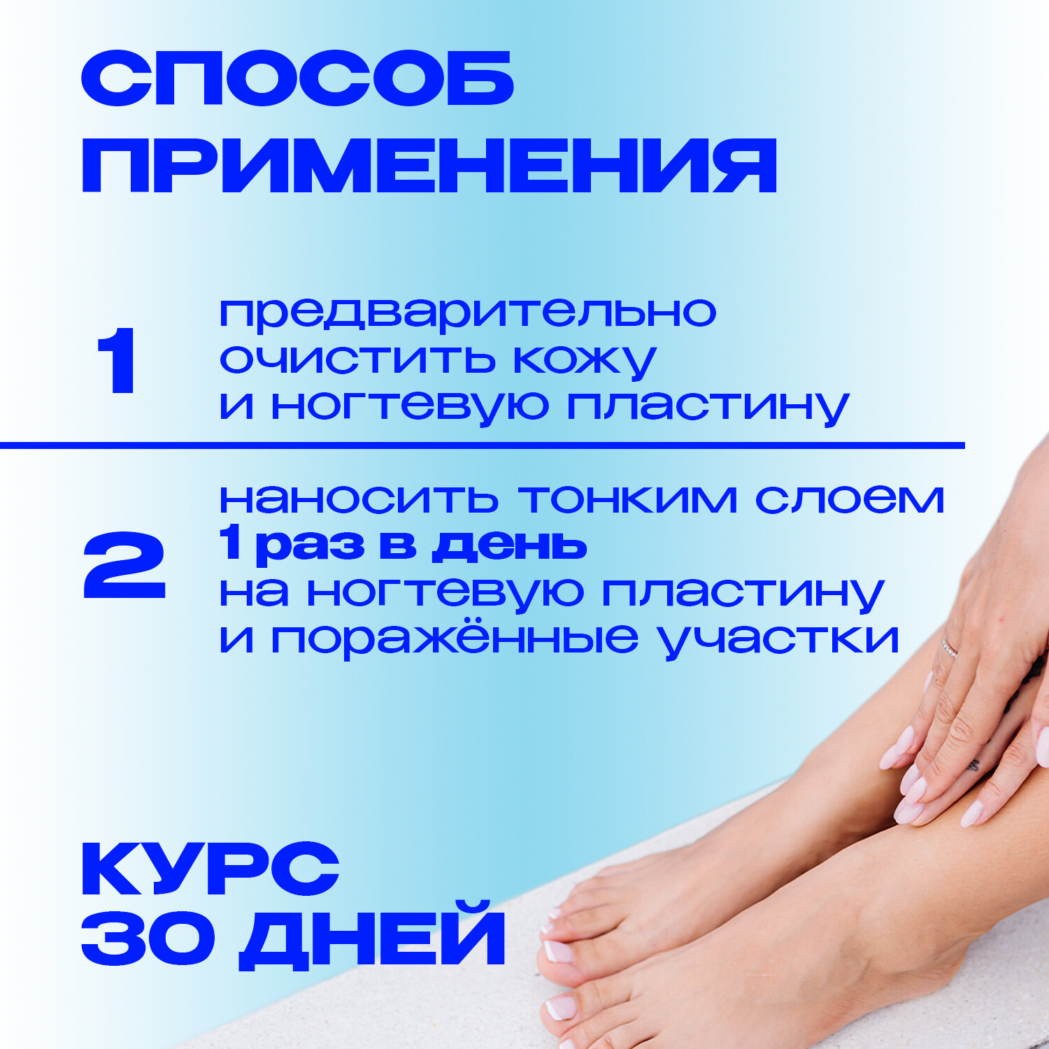 | Способ применения | перед применением рекомендуется размягчить ногтевые пластины, подпилить или подрезать, удалить ороговевшие ткани со стоп. Наносить крем 2 раза в день. Применять средство только на сухую и чистую кожу ног. Курс - 21 день. При необходимости курс можно повторить |