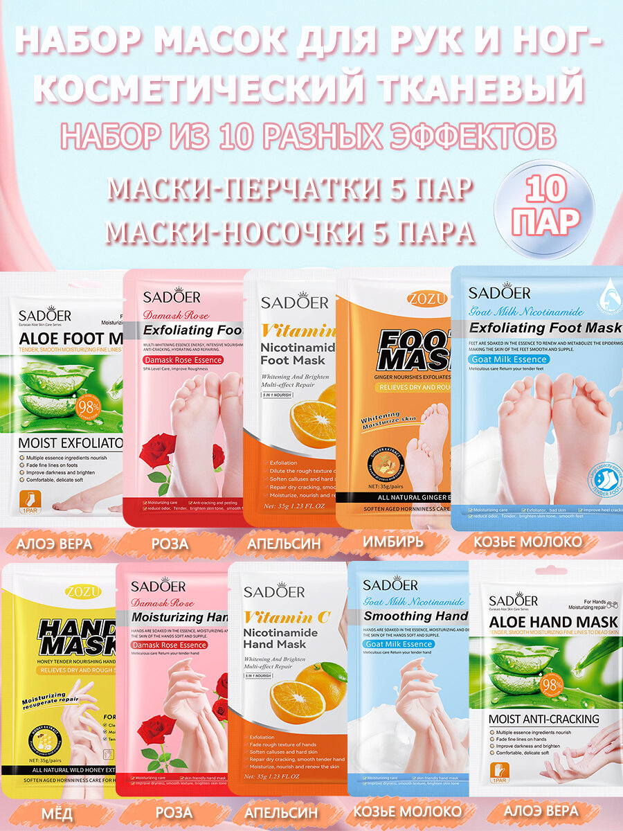 Отзывы на набор перчаток и носочков, для ухода за кожей рук и ног, подходят к повседневному применению, для всех типов кожи,5 пар носочков и 5 пар перчаток