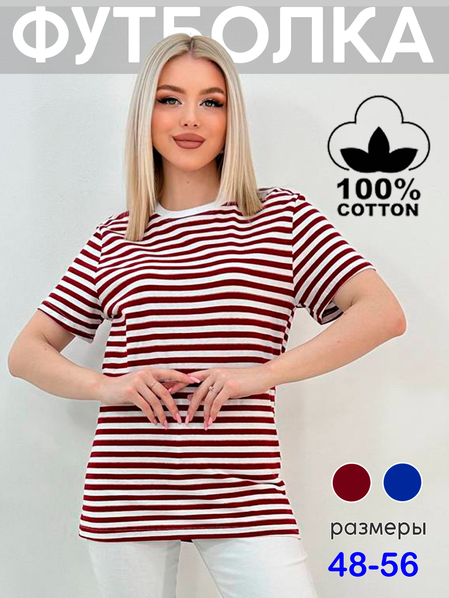 Футболка женская в полоску из 100% хлопка, красная полоска, р.56 560 ₽