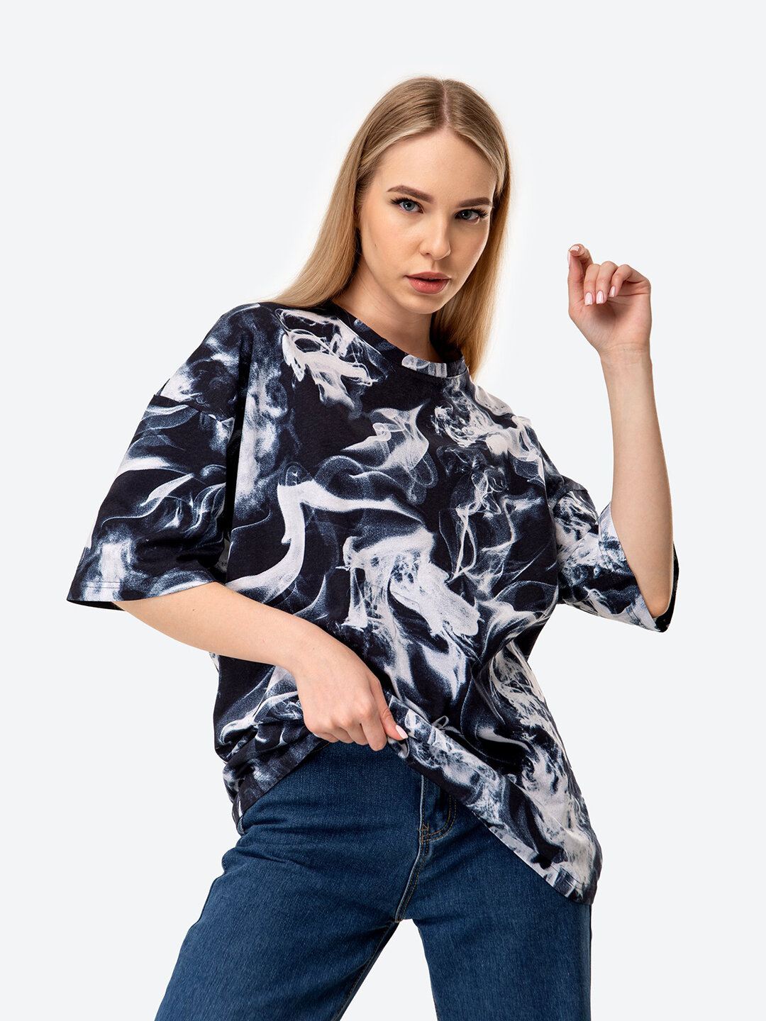 10 цен на Футболка женская оверсайз с принтом унисекс хлопок, HappyFox, HF096SPразмер 48-50, цвет дым.на.т.синем